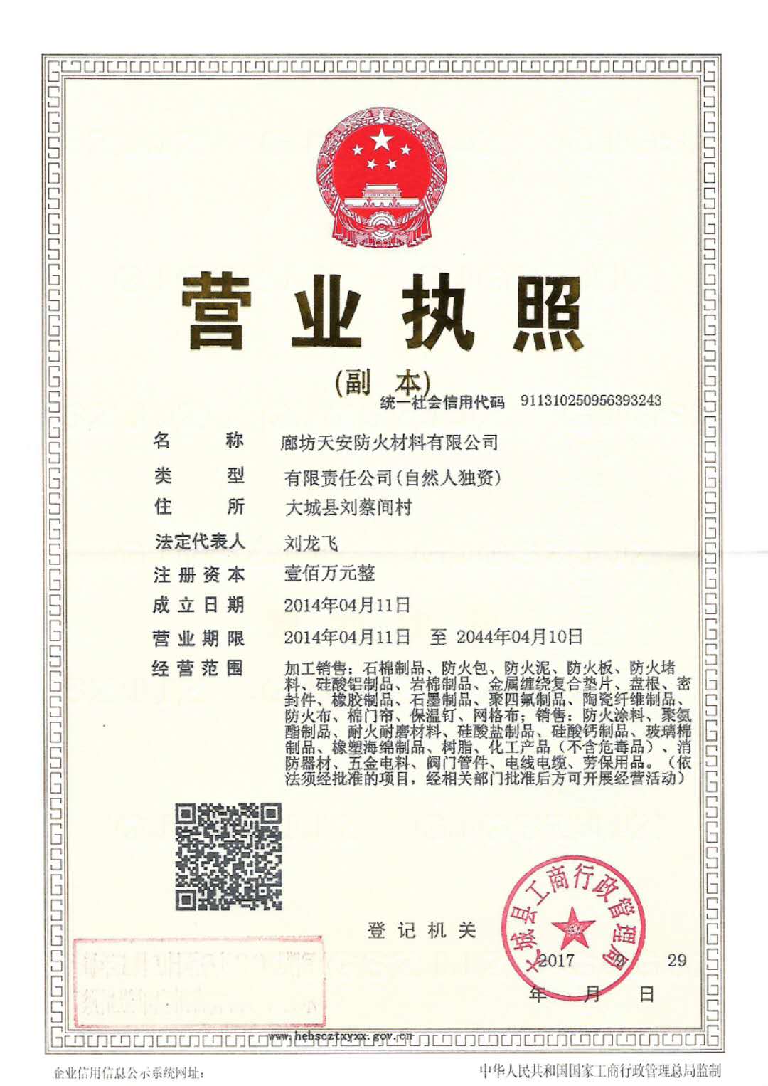 廊坊天安防火材料有限公司,座落在河北省大城縣留各莊工業(yè)區(qū),位于京、津、保三角地帶。 地理位置優(yōu)越!交通十分便利! 我公司擁有國內(nèi)先進(jìn)的工藝和設(shè)備,企業(yè)規(guī)模、產(chǎn)品質(zhì)量在國內(nèi)堪稱一流。 我公司主要產(chǎn)品有阻火包、柔性有機(jī)堵料、石棉布、石棉繩、石棉帶、石棉絨、石棉板、石棉紙、石棉被、阻火模塊、電纜防火涂料、鋼結(jié)構(gòu)防火涂料、防火板、硅膠布、三防布、玻璃纖維布、硅酸鋁纖維板、 硅酸鋁氈、陶瓷纖維板、陶瓷纖維氈、陶瓷纖維紙、聚四氟乙烯制品、齒形墊、石墨制品、各種盤根、金屬纏繞墊、密封材料、外墻保溫釘、網(wǎng)格布等產(chǎn)品。產(chǎn)品規(guī)格齊全! 質(zhì)量穩(wěn)定,深受廣大客戶的認(rèn)可和好評! “以優(yōu)取勝、以誠取信、質(zhì)量第一、用戶至上”是我公司的宗旨,我公司全體員工將以“開拓、進(jìn)取、求實、創(chuàng)新”的精神與國內(nèi)外同仁攜手共進(jìn)共創(chuàng)輝煌,共創(chuàng)美好的明天,并期盼更好的與廣大新老客戶真誠合作。
